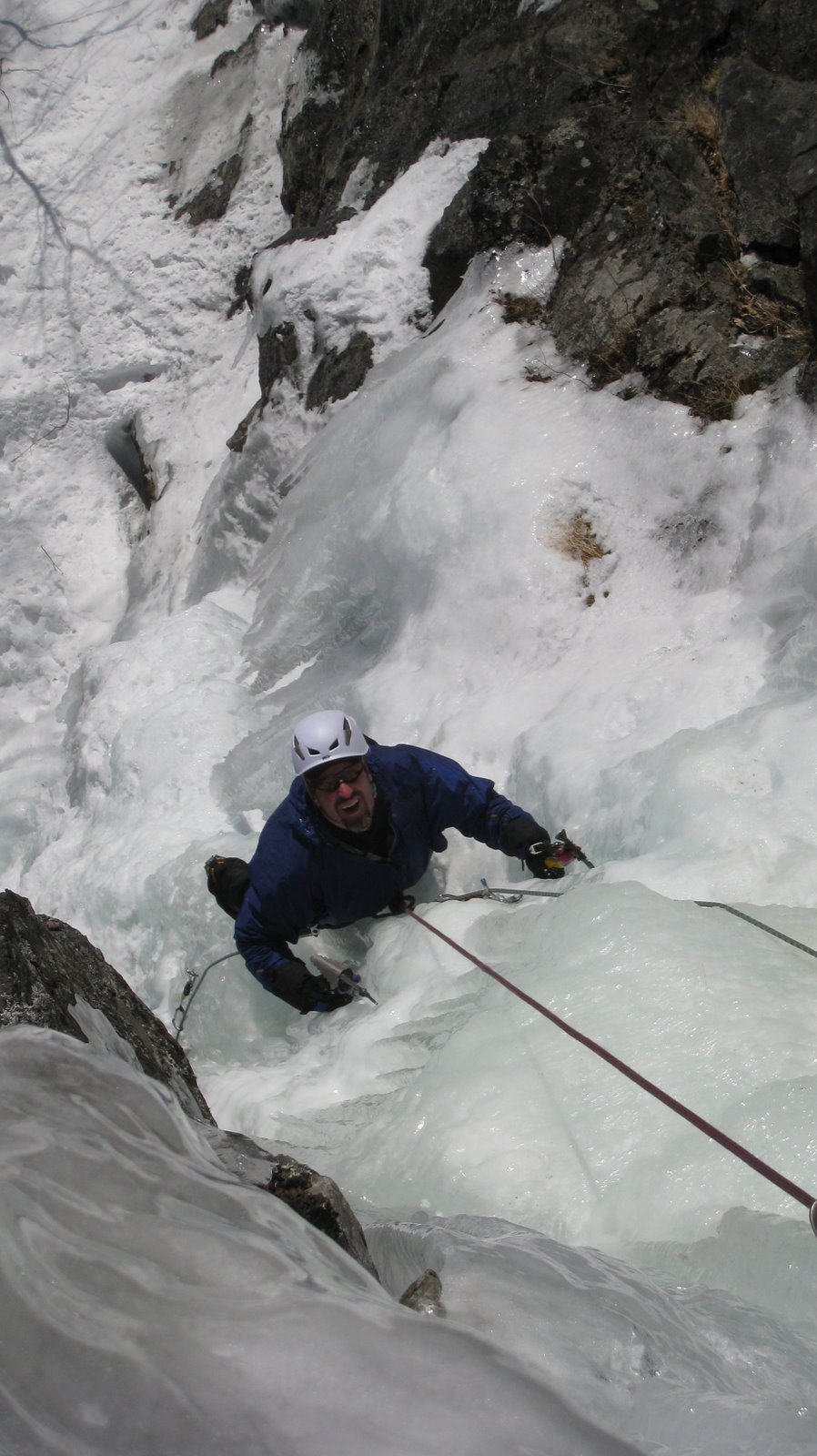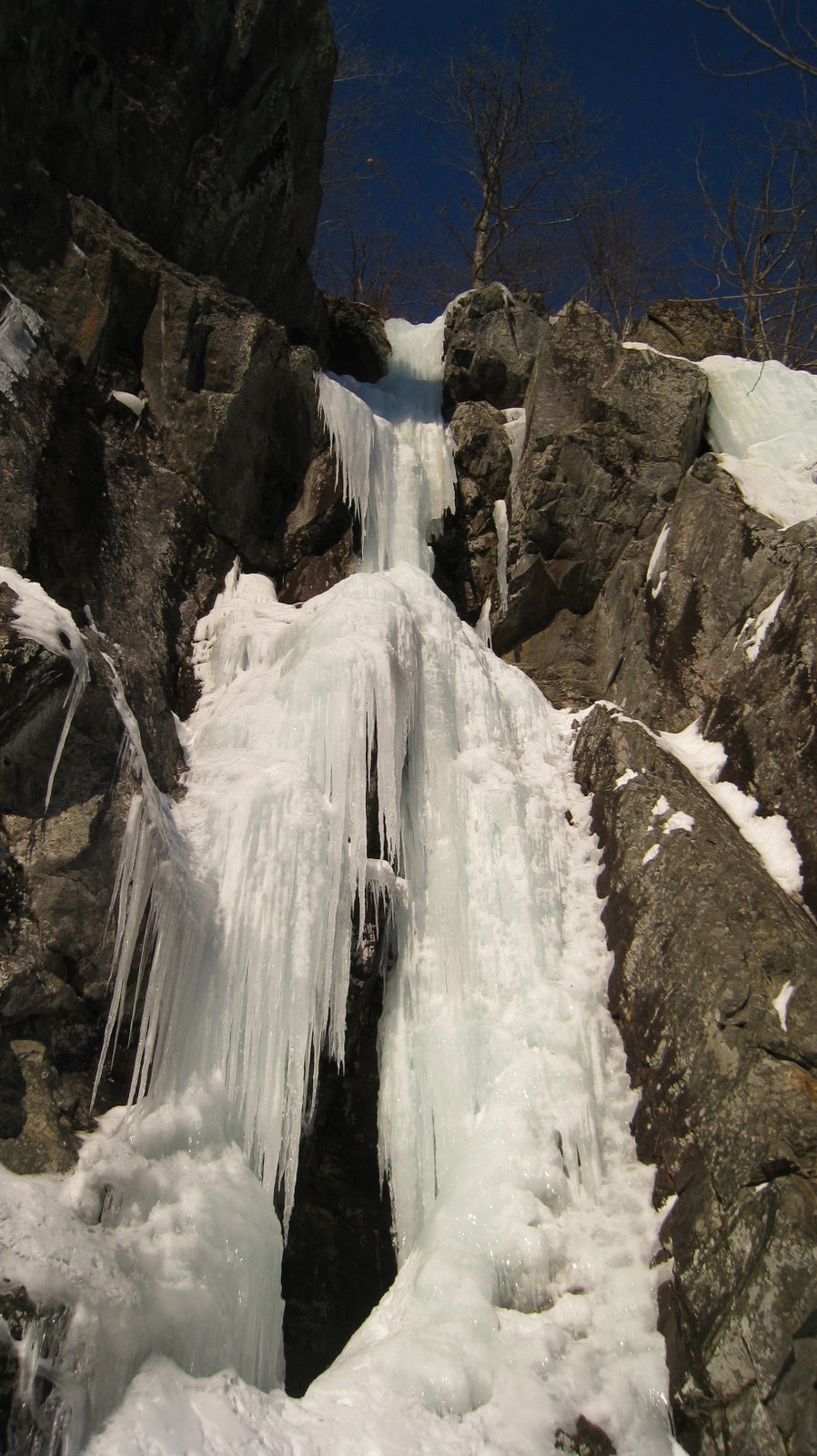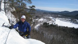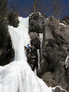 We, AAI guide Tom Kirby and local photographer Nick Goldsmith, checked out a couple classics on Thursday. Starting with what seems to be classic New Hampshire winter morning weather we gathered in the parking lot in 5 degree temperatures and a sustained 10mph breeze… cold! So we were off to find sheltered, but sunny classic lines. We started on “Selsun Blue,” a nice WI4 on the Main Cliff after about a 10 minute approach. Surprisingly the ice was perfectly plastic and our hands didn’t even go numb.