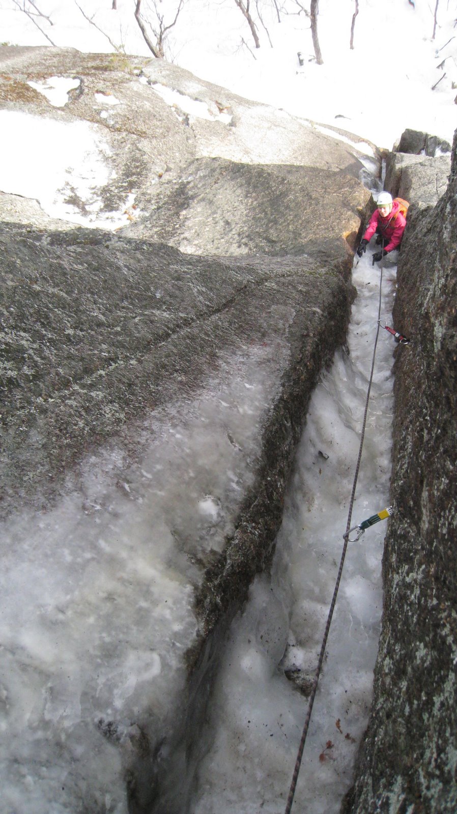 Repentance was first climbed as a wet rock climb in 1959, but found its classic status as a winter route, in 1973, when the 500′ of steep offwidths and chimneys fill with ice. See the pics below…