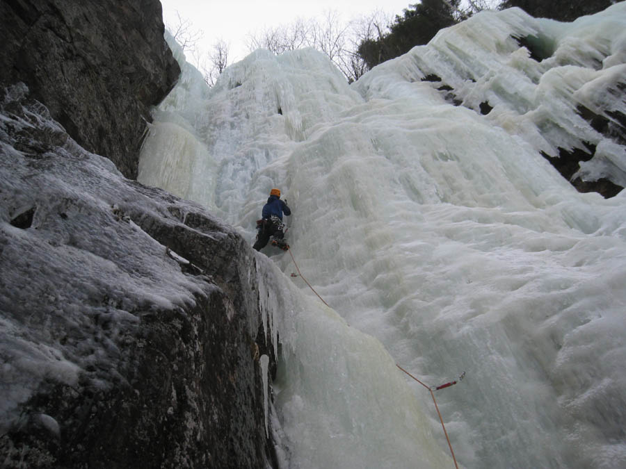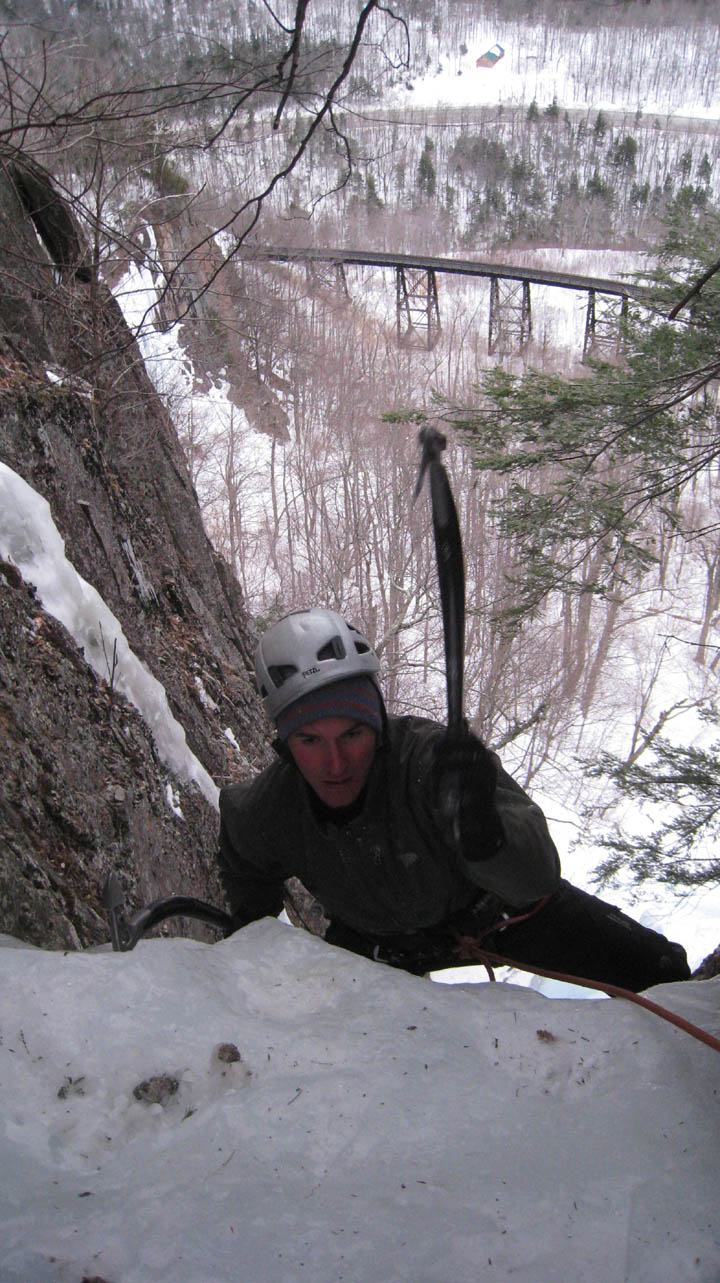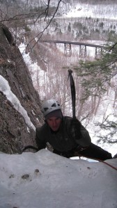 Dustin styling the lead on “Standard Route” WI3 at Frankenstein Cliff.