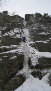 Here are a few photos from our foray thus far in North Conway, NH. After the snow stopped falling yesterday afternoon Dustin and I snuck in an ascent of Repentance, a classic 3 pitch line near town. It was snowy and wet, but still excellent climbing. Enjoy the photos!
