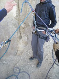 - Person 3: Might need a “fireman’s belay” backup. Is responsible for removing any backup anchors from that rappel station. Also responsible for not clobbering Persons 1 & 2 with debris while rappelling.
