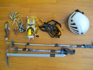 The climbing along our chosen route–the Disappointment Peak Cleaver with variations onto the White Chuck, Gerdine, and Cool Glaciers–is of moderate technical difficulty, especially considering that it’ll still be blanketed in a ton of last winter’s immense snowpack. As such, I’ve gone with aluminum crampons, my lightest harness, and lightest helmet to shed some serious weight while still carrying the essentials. I did bring an ice axe when a Black Diamond Whippet ski pole could probably suffice.