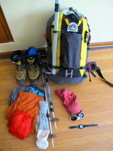 So how does my strategy change for backcountry mountaineering? Initially, I wasn’t thinking that there would be much of a difference, but there must be given the amount of time I’ve spent with my gear today. My main concern, as usual, is weight. There are other factors that are conspiring to have me leave some standard items out of my pack. We have to ride mountain bikes about 7 miles up a closed gravel road to reach the trailhead, so I want a pack that is quite compact and balanced, so that it doesn’t push me around while peddling uphill. We’re also concerned with the potential for sub-optimal trail conditions (downed trees, creek crossings, etc), so I’m looking for a streamlined pack where I don’t have much, if anything, hanging off the outside of the pack.