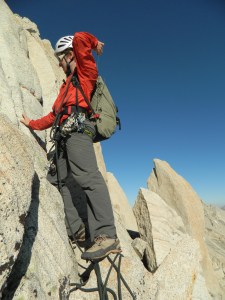 Volume – It’s perfectly sized (about 40 liters) for carrying everything that I need for a multi-day alpine route. Sleeping bag, pad, stove, rack, tent, guide-sized first aid kit, a luxury item (liter of wine)–it all goes in with room to spare. I was even able to cram a bear canister into it while in the Sierra (I filled the canister too)…and then I stuffed a 60M rope, sleeping bag, pad, rack and clothing into the pack! It cinches down to be about 20L (I think) and that’s perfect while climbing technical terrain.