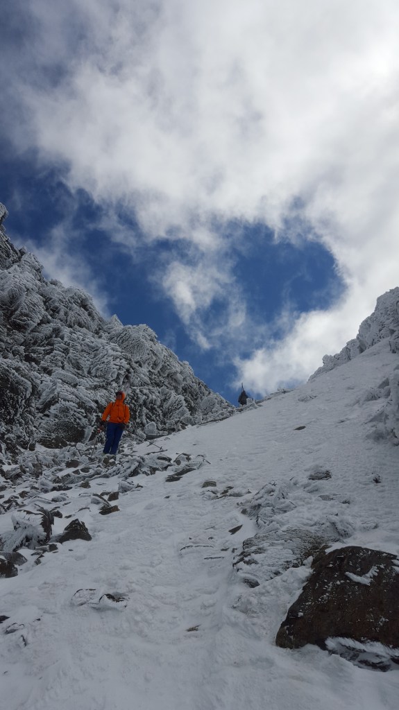 - Approaching the gully on Snowgrass/Grace Lakes. Joe Kelly photo.