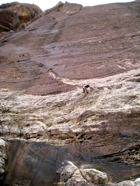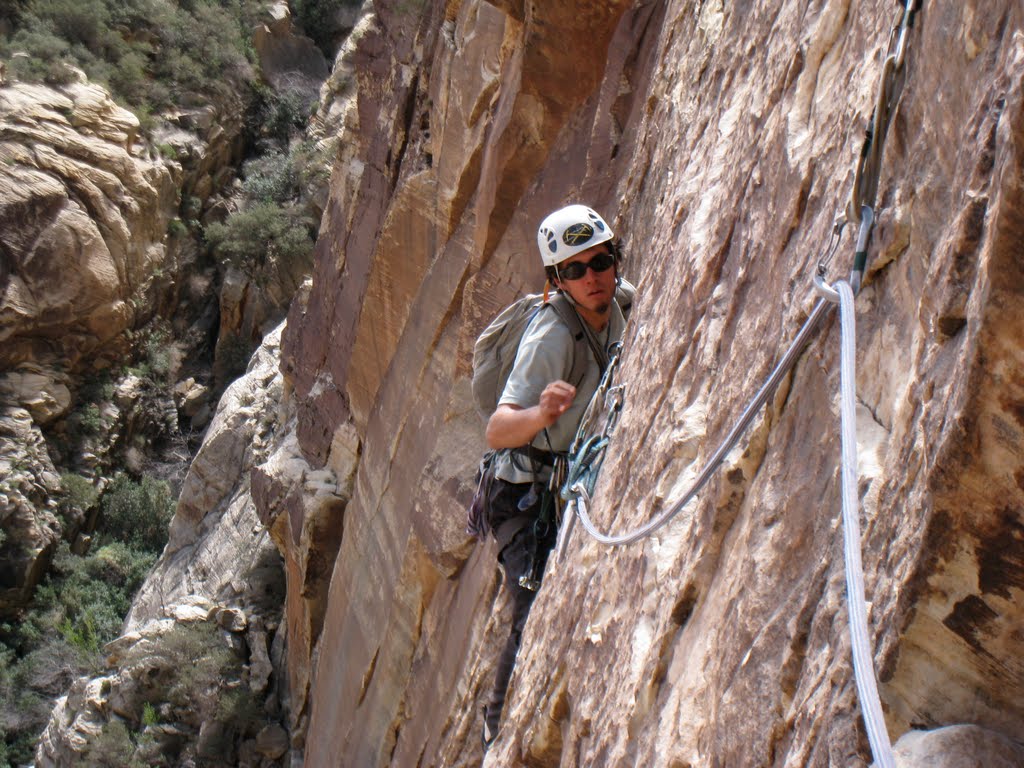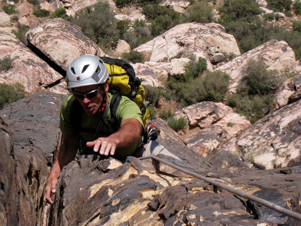 2010 was the year of Red Rock Canyon National Conservation area for me. Between February and October, I spent a total of almost three months climbing in its magnificent canyons and crags. In the spring, when the summits were still snow covered and canyon’s creeks were flowing high, I was training for, then taking, the AMGA Rock Guide Course. We did some excellent climbing including Olive Oil (III, 5.7), Dream of Wild Turkeys (III, 5.10a), Nightcrawler (II, 5.10c), The Walker Spur (II, 5.10b), and the full Geronimo (III+, 5.8).