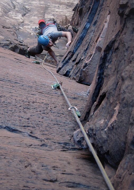 In the warm and sweaty days of fall, I got in a little more training before taking my AMGA Rock Guide exam. My friend and AAI co-worker Danny Uhlmann was also taking the exam and we completed a number of excellent climbs prior to its start. We made the most of our prep time, climbing Risky Business into Dark Shadows (III+, 5.10c R) in Pine Creek Canyon, Rock Warrior in Black Velvet Canyon (III, 5.10b R), Community Pillar (III, 5.8) in Pine Creek, Gin Ricky (I, 5.10c) and Birthday Party (II, 5.6) in First Creek Canyon, and Solar Slab to Eagle Dance (IV, 5.10) in Oak Creek Canyon.
