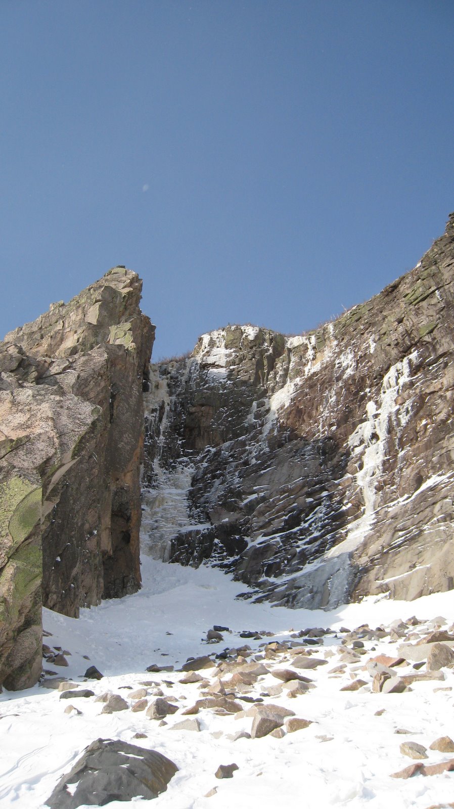 Repentance was first climbed as a wet rock climb in 1959, but found its classic status as a winter route, in 1973, when the 500′ of steep offwidths and chimneys fill with ice. See the pics below…